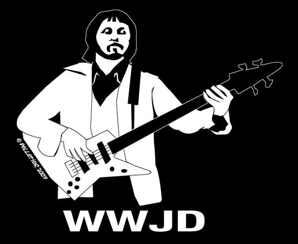 Updated WWJD T-Shirts (13 January 2011) - A play on the "What Would Jesus Do?" hats, t-shirts and accompanying lectures and disapprovals that inevitibly follow, I have recast it as "What Would John Do?", a common question in my mind as I learned the music, stage persona and life of THE WHO bassist John Entwistle while performing in a Who tribute band (which ended in 2010). John himself answered this question definitively by dying in a Las Vegas hotel room with a pair of strippers and (apparently) too much cocaine. I prefer to concentrate on his musical choices when asking this quesiton, but you can think what you want... I have had t-shirts professionally manufactured with this original art, and it already seems to be a hit with bassists and Entwistle fans worldwide. There are now BLACK SHIRTS and GREY SHIRTS, and I am catching up on filling orders starting in February 2011. Order yours today - $20 + $5 USA/Canada shipping, all others email first for rates. Available in men's Medium and Large Hanes tees, they fit a bit large, and don't seem to shrink much.
